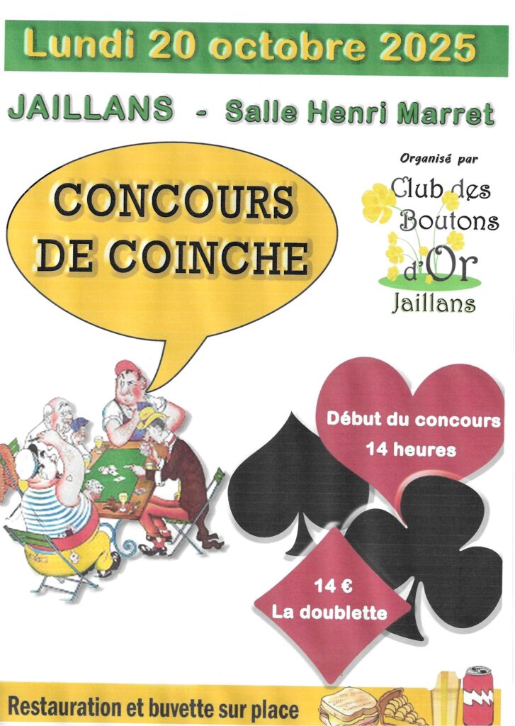 Concours de coinche à Jaillans le 20 octobre 2025 Publication publiée :5 octobre 2025 Commentaires de la publication :0 commentaire Concours de coinche, salle Henri Marret le lundi 20 octobre 2025 Organisé par le club des Boutons d’Or de JAILLANS, début du concours: 14h .14 euros la doublette. Restauration et buvette sur place Imprimer Vous devriez également aimer Repas dansant au restaurant des Balmes : Le Tahiti, le 07 novembre 2025 13 octobre 2025 La fête de l’amitié 2025 a eu lieu à Saint-Donat sur l’herbasse le 11 septembre 24 septembre 2025 Concours Régional de Pétanque à Saint-Donat sur L’Herbasse 3 juillet 2024 Laisser un commentaire Annuler la réponseCommentEnter your name or username to comment Enter your email address to comment Saisir l’URL de votre site (facultatif) Enregistrer mon nom, mon e-mail et mon site dans le navigateur pour mon prochain commentaire.