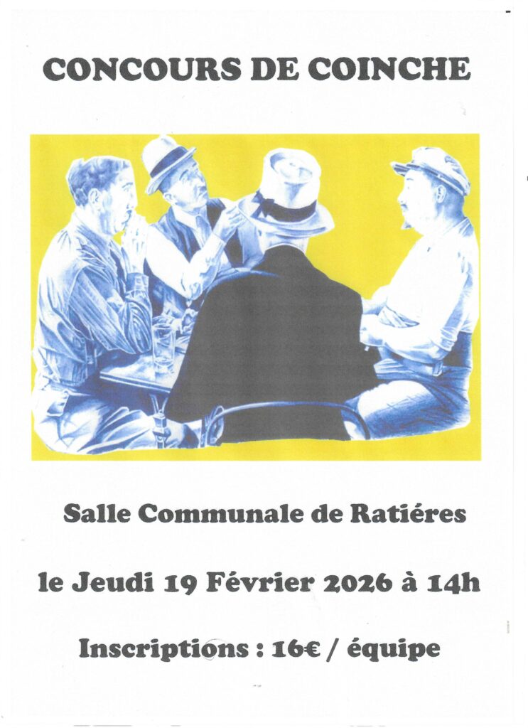 Concours de coinche à Ratières le 19 février 2026 Publication publiée :4 février 2026 Commentaires de la publication :0 commentaire Organisé par le club ACCUEIL ET AMITIE DE RATIERES. Concours de coinche le jeudi 19 février 2026 à 14hSalle communale de RATIERES.Inscriptions : 16 euros/ équipe Imprimer Vous devriez également aimer Le coin des puzzles de Générations Mouvement 21 janvier 2025 Concours de coinche à Rochefort Samson le jeudi 12 février 2026 19 janvier 2026 Concours de coinche à Jaillans le lundi 9 février 2026. 19 janvier 2026 Laisser un commentaire Annuler la réponseCommentEnter your name or username to comment Enter your email address to comment Saisir l’URL de votre site (facultatif) Enregistrer mon nom, mon e-mail et mon site dans le navigateur pour mon prochain commentaire.