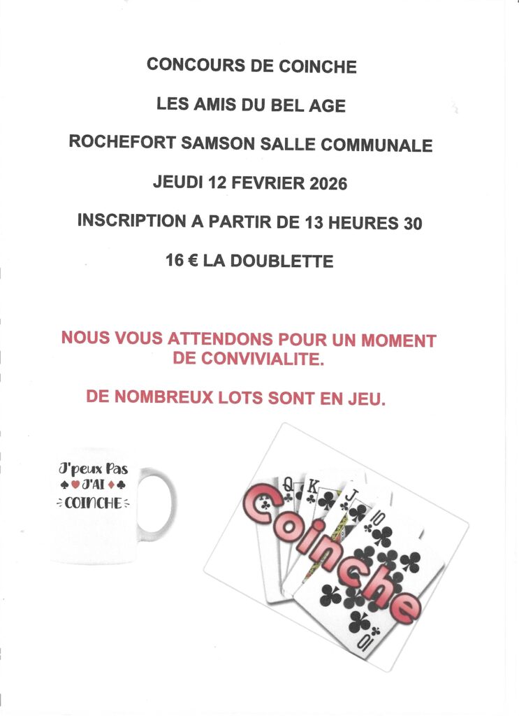 Le club: LES AMIS DU BEL AGE, organise un concours de coinche le jeudi 12 février 2026, salle communale à Rochefort Samson.