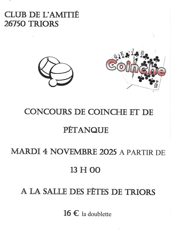 Concours de coinche et de pétanque à Triors le 4 novembre 2025 Publication publiée :14 octobre 2025 Commentaires de la publication :0 commentaire Concours de coinche et pétanque le mardi 4 novembre 2025 à la salle des fêtes de Triors Le CLUB DE L’AMITIE de TRIORS, organise un concours de coinche et pétanque le mardi 4 novembre 2025 à partir de 13h .Le lieu : SALLE DES FETES de TRIORS.16 euros la doublette. PHOTOS DE LA FETE DE L’AMITIE 2025, JEUX DE CARTES L’APRES-MIDI Imprimer Vous devriez également aimer Le coin des puzzles de Générations Mouvement 21 janvier 2025 Concours de coinche à Peyrins le 27 octobre 2025 13 octobre 2025 25eme concours national de pétanque à Argelès-sur-Mer 5 juin 2024 Laisser un commentaire Annuler la réponseCommentEnter your name or username to comment Enter your email address to comment Saisir l’URL de votre site (facultatif) Enregistrer mon nom, mon e-mail et mon site dans le navigateur pour mon prochain commentaire.