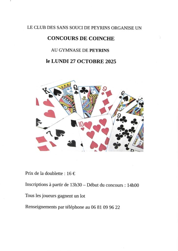 Concours de coinche à Peyrins le 27 octobre 2025 Publication publiée :13 octobre 2025 Commentaires de la publication :0 commentaire Concours de coinche, au gymnase de Peyrins le 27 Octobre 2025 Concours de coincheLorem ipsum dolor sit amet, consectetur adipiscing elit. Ut elit tellus, luctus nec ullamcorper mattis, pulvinar dapibus leo. Imprimer Vous devriez également aimer La fête de l’amitié 2025 a eu lieu à Saint-Donat sur l’herbasse le 11 septembre 24 septembre 2025 Concours Régional de Pétanque à Saint-Donat sur L’Herbasse 3 juillet 2024 Séjour à Mimizan Plage 19 juillet 2023 Laisser un commentaire Annuler la réponseCommentEnter your name or username to comment Enter your email address to comment Saisir l’URL de votre site (facultatif) Enregistrer mon nom, mon e-mail et mon site dans le navigateur pour mon prochain commentaire.